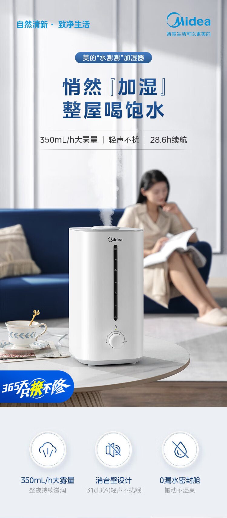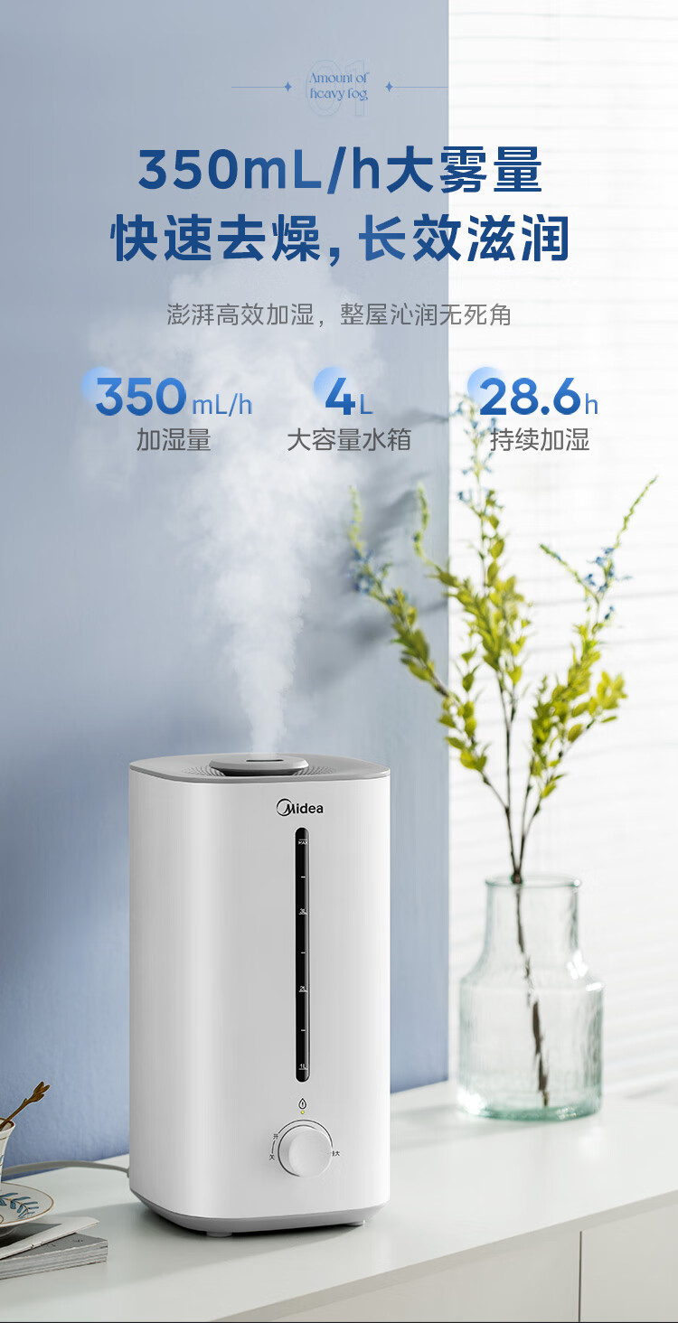 美的(Midea)【行业第一】加湿器家用大雾量卧室轻音婴儿加湿办公室桌面迷你便携银离子大容量室内空调伴侣40s